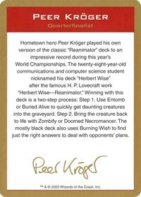 Hometown hero Peer Kroger played his own version of the classic "Reanimator" deck to an impressive record during this year's World Championships. The twenty-eight-year-old communications and computer science student nicknamed his deck "Herbert Wise" after the famous H.P. Lovecraft work "Herbert Wise—Reanimator." Winning with this deck is a two-step process: Step 1. Use Entomb or Buried Alive to quickly get daunting creatures into the graveyard. Step 2. Bring the creature back to life with Zombify or Doomed Necromancer. The mostly black deck also uses Burning Wish to find just the right answers to deal with opponents' plans.