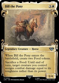 When Bill the Pony enters the battlefield, create two Food tokens. (They're artifacts with "2, T, Sacrifice this artifact: You gain 3 life.")
