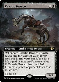 Whenever Caustic Bronco attacks, reveal the top card of your library and put it into your hand. You lose life equal to that card's mana value if Caustic Bronco isn't saddled. Otherwise, each opponent loses that much life.