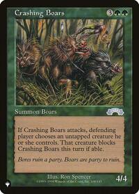 If Crashing Boars attacks, defending player chooses an untapped creature he or she controls. That creature blocks Crashing Boars this turn if able.