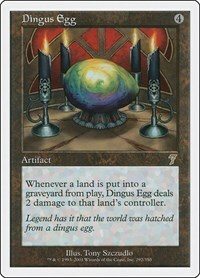 Whenever a land is put into a graveyard from play, Dingus Egg deals 2 damage to that land’s controller.