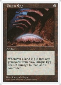 Whenever a land is put into any graveyard from play, Dingus Egg deals 2 damage to that land’s controller.