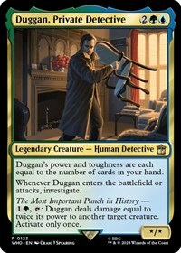 Whenever Duggan enters the battlefield or attacks, investigate.