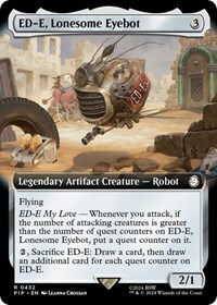 ED-E My Love — Whenever you attack, if the number of attacking creatures is greater than the number of quest counters on ED-E, Lonesome Eyebot, put a quest counter on it.