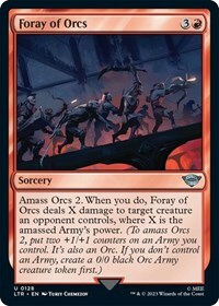 Amass Orcs 2. When you do, Foray of Orcs deals X damage to target creature an opponent controls, where X is the amassed Army's power. (To amass Orcs 2, put two +1/+1 counters on an Army you control. It's also an Orc. If you don't control an Army, create a 0/0 black Orc Army creature token first.)