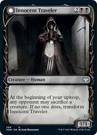At the beginning of your upkeep, any opponent may sacrifice a creature. If no one does, transform Innocent Traveler.