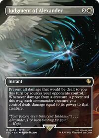 Prevent all damage that would be dealt to you this turn by sources your opponents control. Whenever damage from a creature is prevented this way, each commander creature you control deals damage equal to its power to that creature.