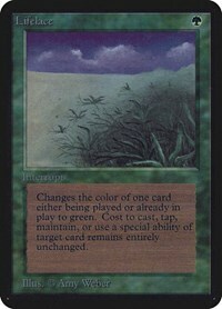 Changes the color of one card either being played or already in play to green. Cost to cast, tap, maintain, or use a special ability of target card remains entirely unchanged.