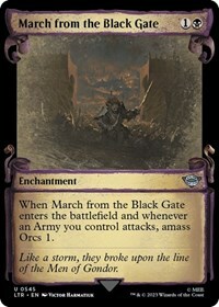 When March from the Black Gate enters the battlefield and whenever an Army you control attacks, amass Orcs 1. (Put a +1/+1 counter on an Army you control. It's also an Orc. If you don't control an Army, create a 0/0 black Orc Army creature token first.)