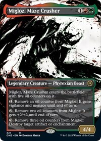 3, Remove three oil counters from Migloz: Destroy target artifact or enchantment.