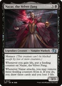 Whenever you gain life, put a feeding counter on Nazar, the Velvet Fang.