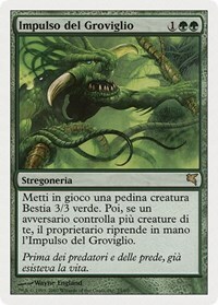 Create a 3/3 green Beast creature token. Then if an opponent controls more creatures than you, return Pulse of the Tangle to its owner’s hand.