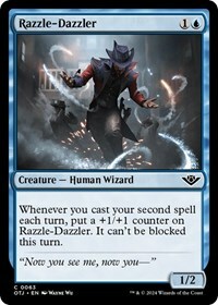 Whenever you cast your second spell each turn, put a +1/+1 counter on Razzle-Dazzler. It can't be blocked this turn.