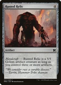 Metalcraft — Rusted Relic is a 5/5 Golem artifact creature as long as you control three or more artifacts.