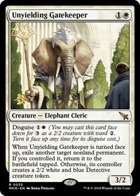When Unyielding Gatekeeper is turned face up, exile another target nonland permanent. If you controlled it, return it to the battlefield tapped. Otherwise, its controller creates a 2/2 white and blue Detective creature token.