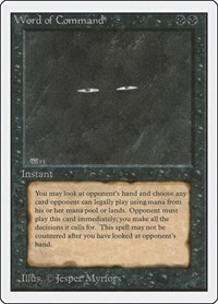 You may look at opponent’s hand and choose any card opponent can legally play using mana from his or her mana pool or lands. Opponent must play this card immediately; you make all the decisions it calls for. This spell may not be countered after you have looked at opponent’s hand.