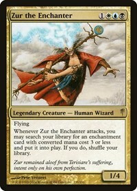 Whenever Zur the Enchanter attacks, you may search your library for an enchantment card with converted mana cost 3 or less and put it into play. If you do, shuffle your library.